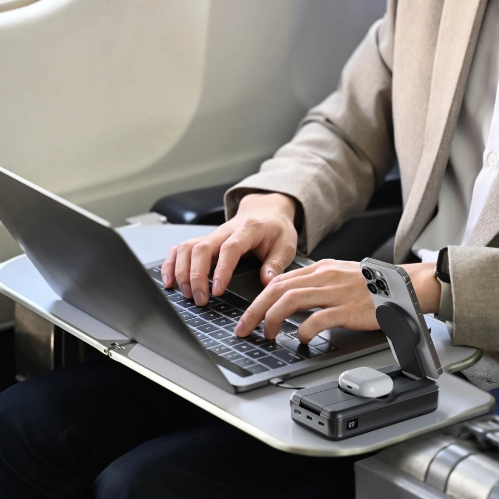 Powerbanken har en kompakt, kantrundad och hopfällbar design som enkelt glider ner i vilken reseväska som helst. Den unika inbyggda USB-C-kabeln gör att du aldrig behöver leta efter en laddningskabel igen. Den hopfällbara konstruktionen samlar kablar och laddningsmoduler i en enda kompakt enhet – perfekt för resan.