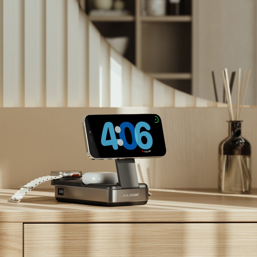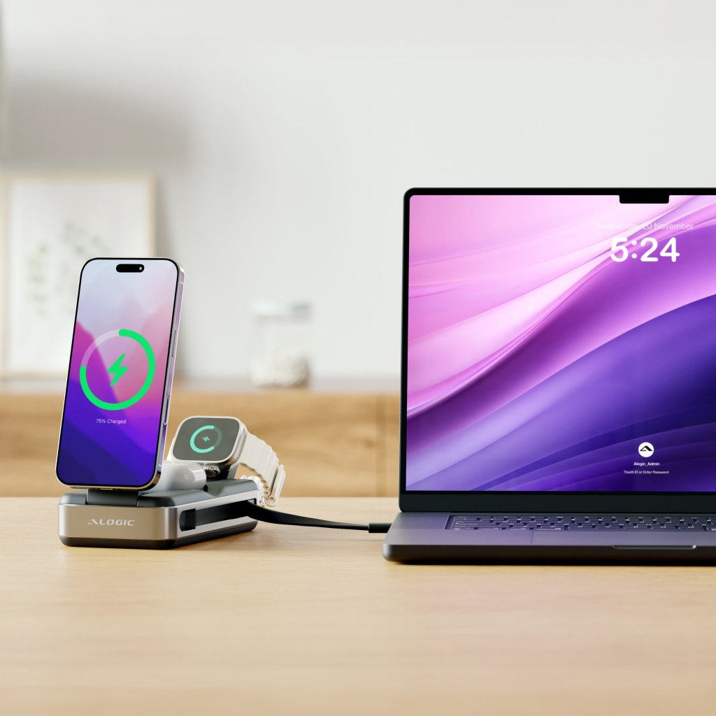 ALOGIC Roam-powerbanken kan snabblada en telefon, hörlurar och Apple Watch samtidigt som den laddar upp en bärbar dator – allt i ett och samma tillbehör. Med flera portar och en trådlös laddare kan du försörja nästan alla enheter du tar med dig. Stöder samtidig laddning via USB-C-portar, Qi2 trådlös laddning och integrerad Apple Watch-laddare.