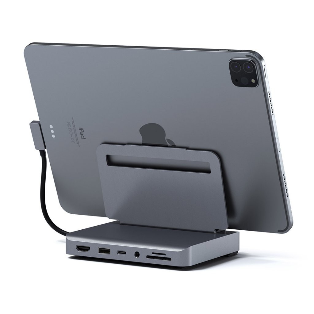 Med Satechi Aluminum Stand Hub bliver din iPad Pro til en funktionel arbejdsstation. Den har USB-C PD-opladning, USB-A-data, 4K HDMI, micro/SD-kortlæsere og en lydstikport; alt det, du har brug for til at fuldføre arbejdet uden at have brug for et skrivebord.