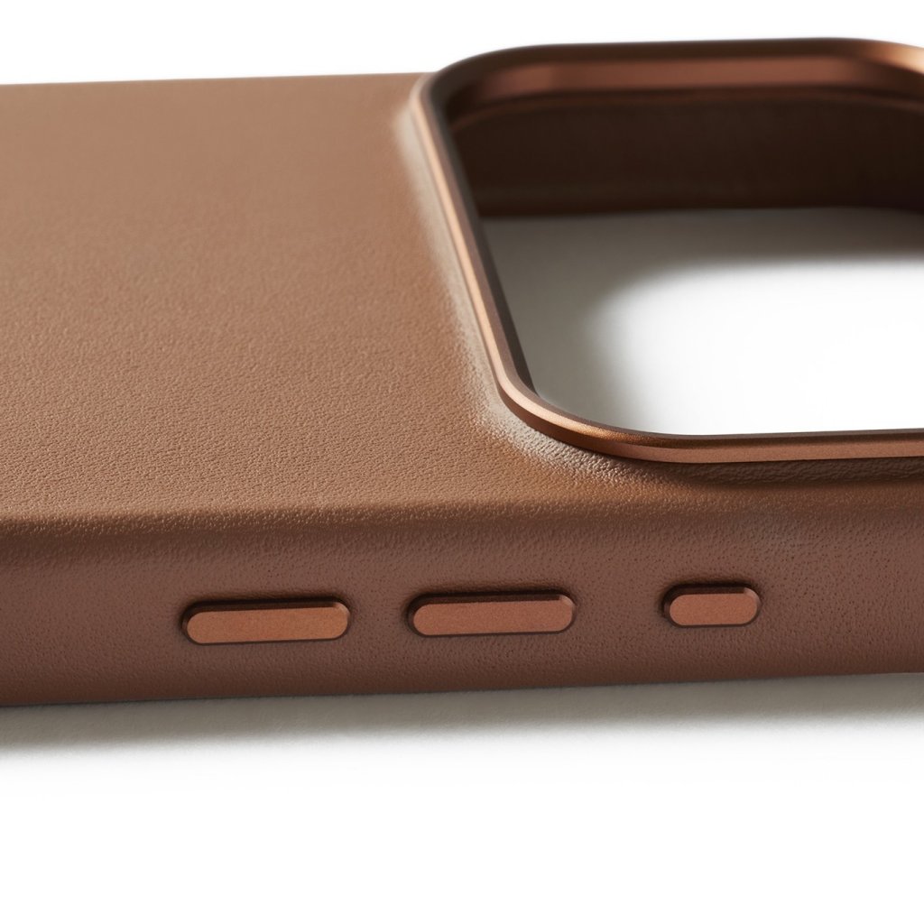 The side buttons are meticulously crafted from machined metal for optimal responsiveness. They provide a super-satisfying clickiness and are dyed to match the rich Tan leather. This attention to detail aligns with our minimalist design philosophy. Cases for the iPhone 17 models feature precise, machined-metal buttons that enhance both durability and responsiveness.