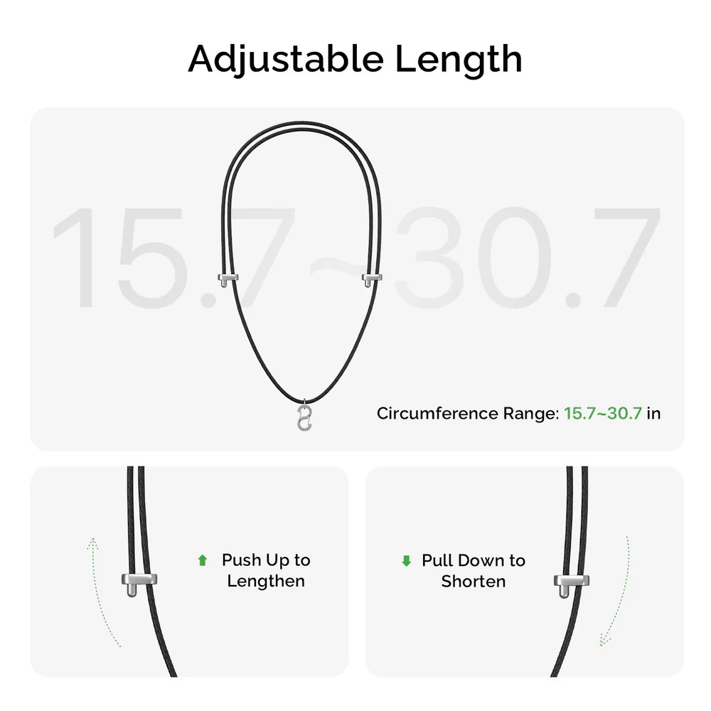 En dobbel justeringsdesign gjør det enkelt å stille inn din perfekte lengde. Med et bredt justeringsområde kan du plassere NotePin akkurat der du vil ha den for rask tilgang, samtidig som den sitter komfortabelt rundt halsen hele dagen.