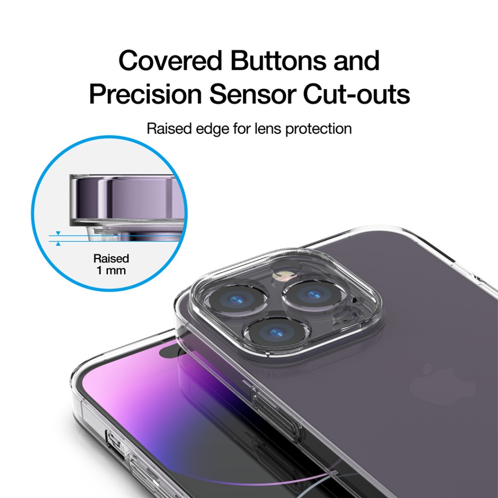 En hevet ramme rundt kameraet bidrar til å beskytte linsene når du legger fra deg telefonen. Knappene er dekket for beskyttelse, samtidig som de beholder en responsiv klikkfølelse, og dekselet har dype utskjæringer for enkel tilgang der det trengs.