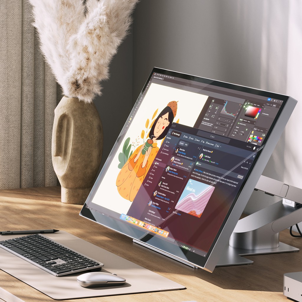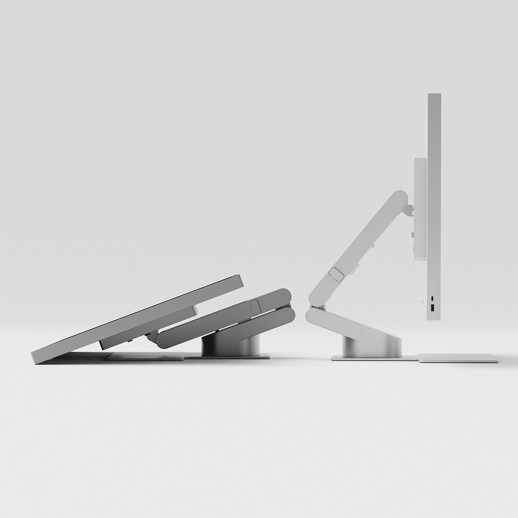 Fell monitoren ned slik at den kommer nærmere skrivebordet, og Aspekt Touch blir en tegneflate i stort format. Vinkelen er ment å støtte lange kreative økter og gir en stabil, nettbrettlignende arbeidsstilling for skissing og detaljert interaksjon på skjermen.