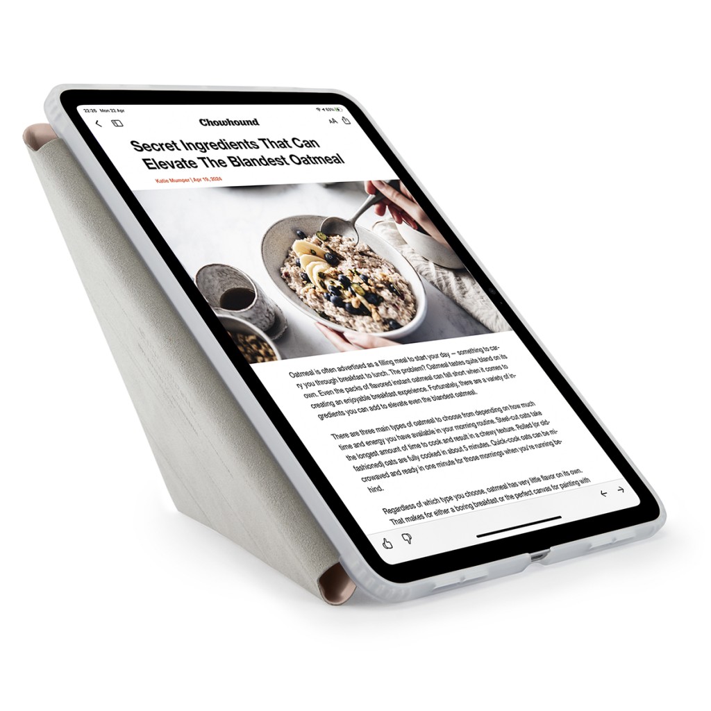 Vårt unike Origami-deksel vil revolusjonere måten du bruker iPad Air på. Brett ut og ordne dekselet i ulike posisjoner, inkludert stående for lesing eller videosamtaler, ergonomisk liggende for komfortabel skriving og tegning, og flere liggende vinkler for optimale visningsopplevelser på alle overflater.