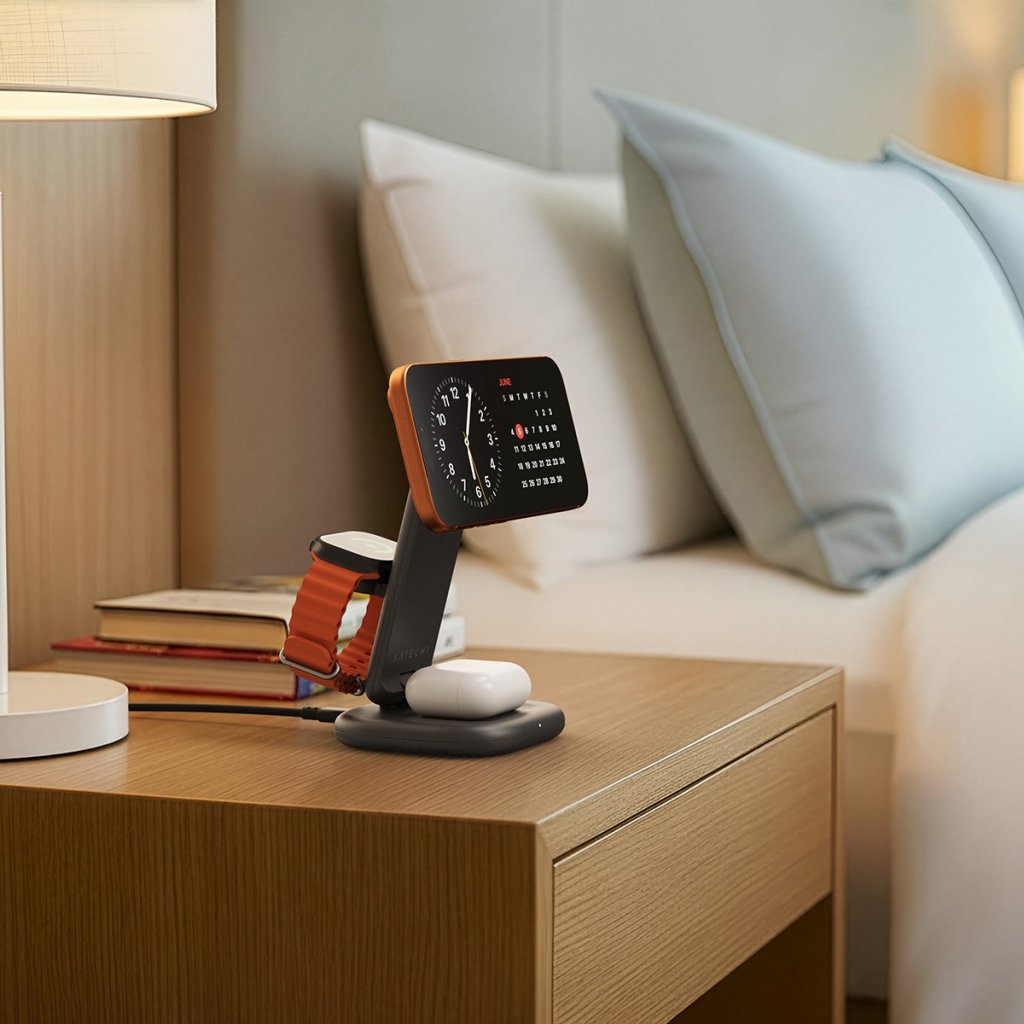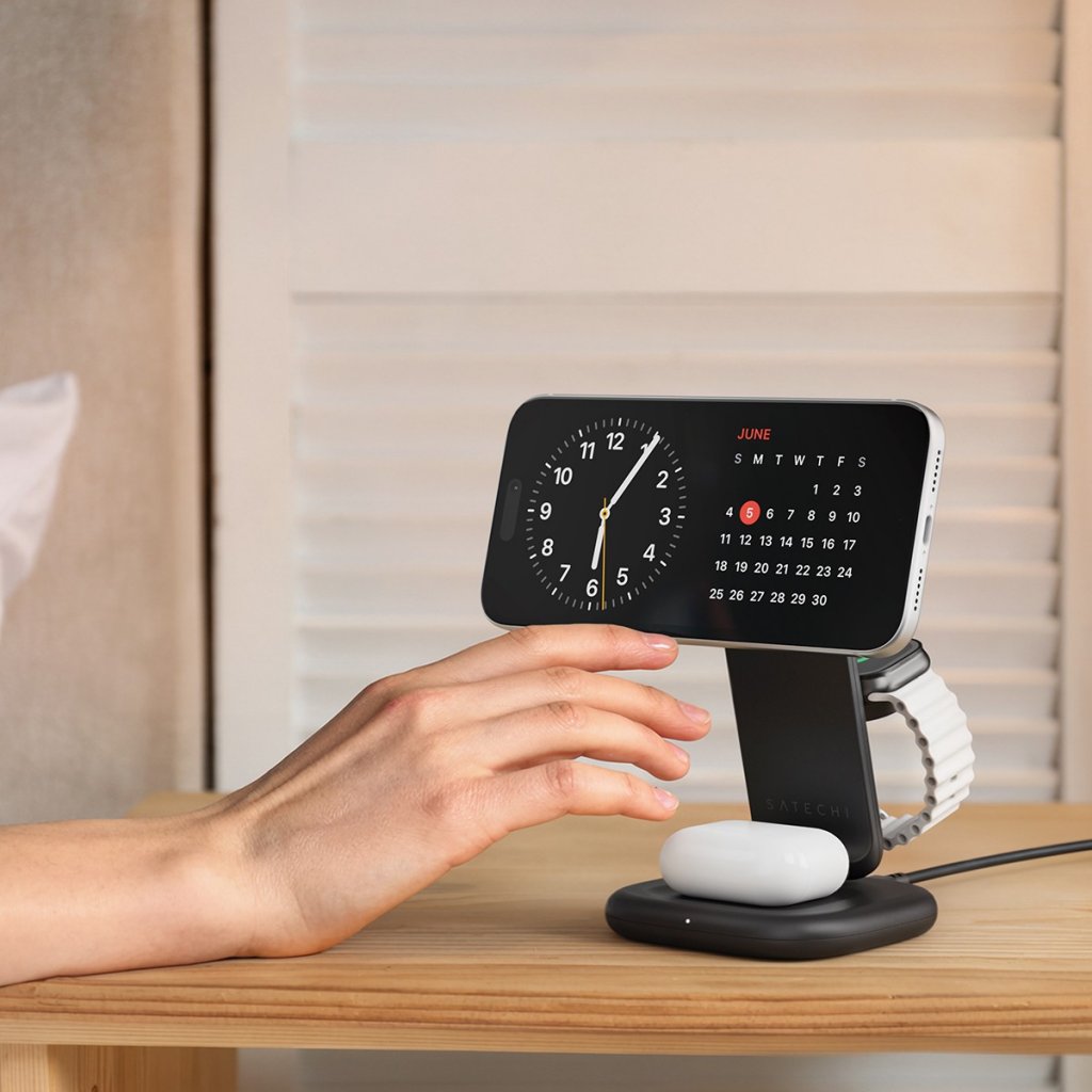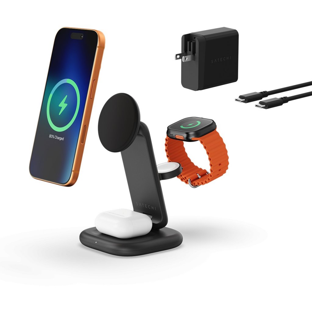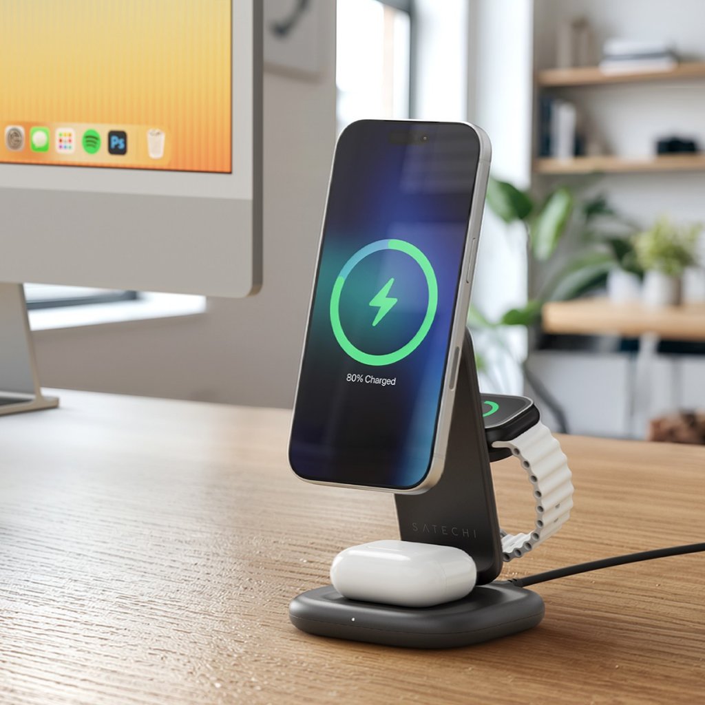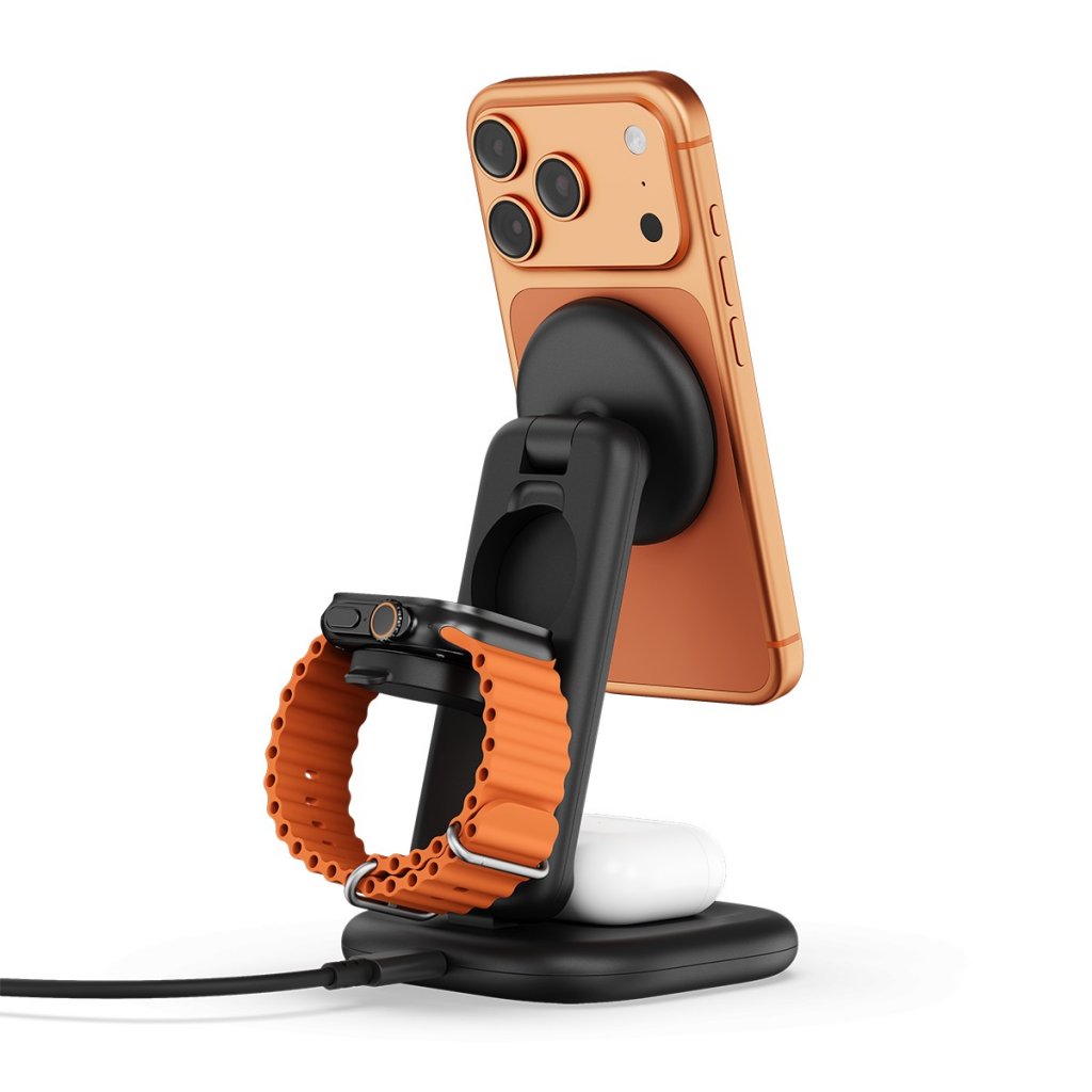Ett ställ hanterar tre enheter samtidigt, vilket eliminerar behovet av separata laddare som tar upp plats på skrivbordet eller nattduksbordet. iPhone-plattan ger upp till 25 W, medan plattorna för Apple Watch och öronsnäckor ger upp till 5 W vardera. Snabbladdning för Apple Watch stöds för Apple Watch Series 7 till 11, Apple Watch SE 3 och Apple Watch Ultra Gen 1 till 3.