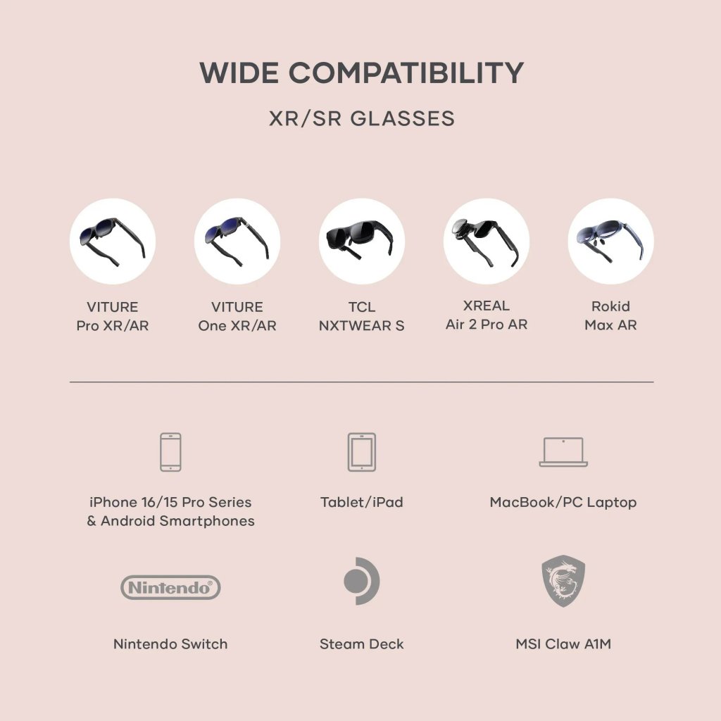 - Kompatibilitet: Bärbara datorer, smartphones, surfplattor (iPhone 15/16-serien, iPad Pro, iPad Air, MacBook Pro (M1, M2, M3, M4), MacBook Air, bärbara PC-datorer, Android-surfplattor, Android-smartphones, Steam Deck, Nintendo Switch (OLED), Lenovo Legion Go, Viture, Xreal, Rokid, TCL RayNeo,